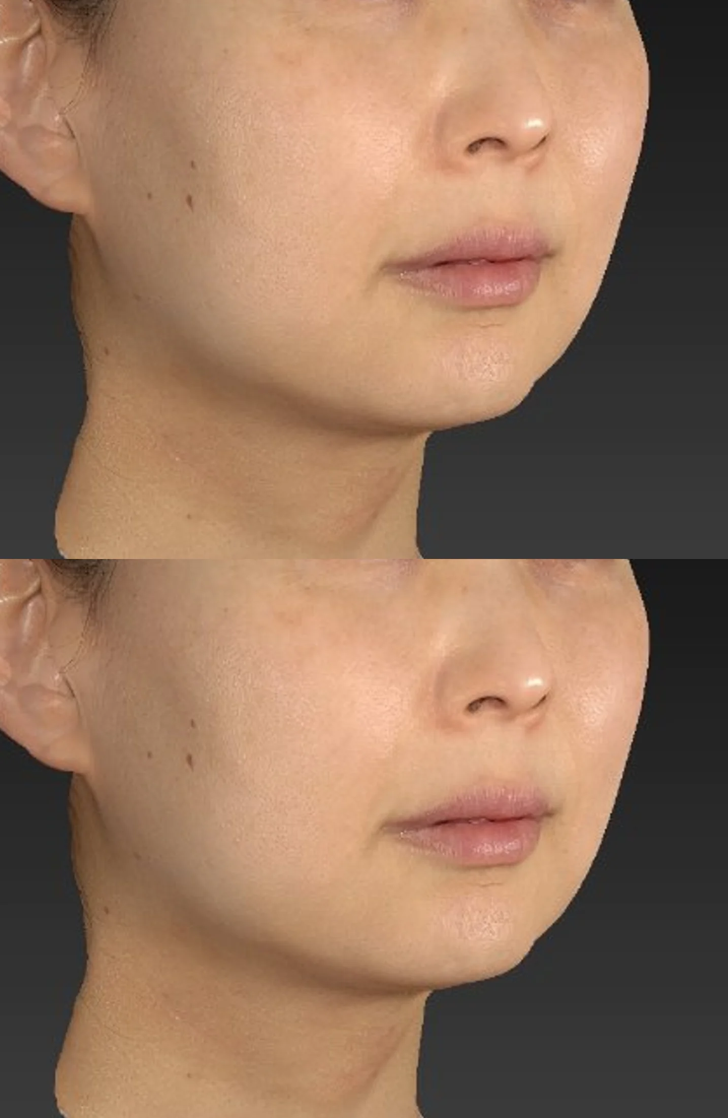 この患者様は、顎にヒアルロン酸を他院で入れておられましたが、今回口横のボリュームを気にされてご来院されました。顎先のみ突出し、口回りの影が目立つ状態でしたので、まずデンシティでマリオネット周りを特に引き締め、さらにヒアルロン酸を顎先以外の周りに注入することで、下顔面の輪郭が整いました。 |