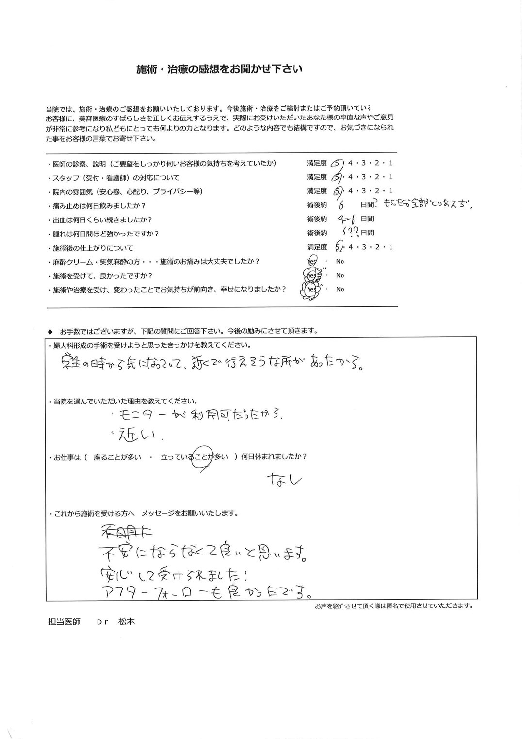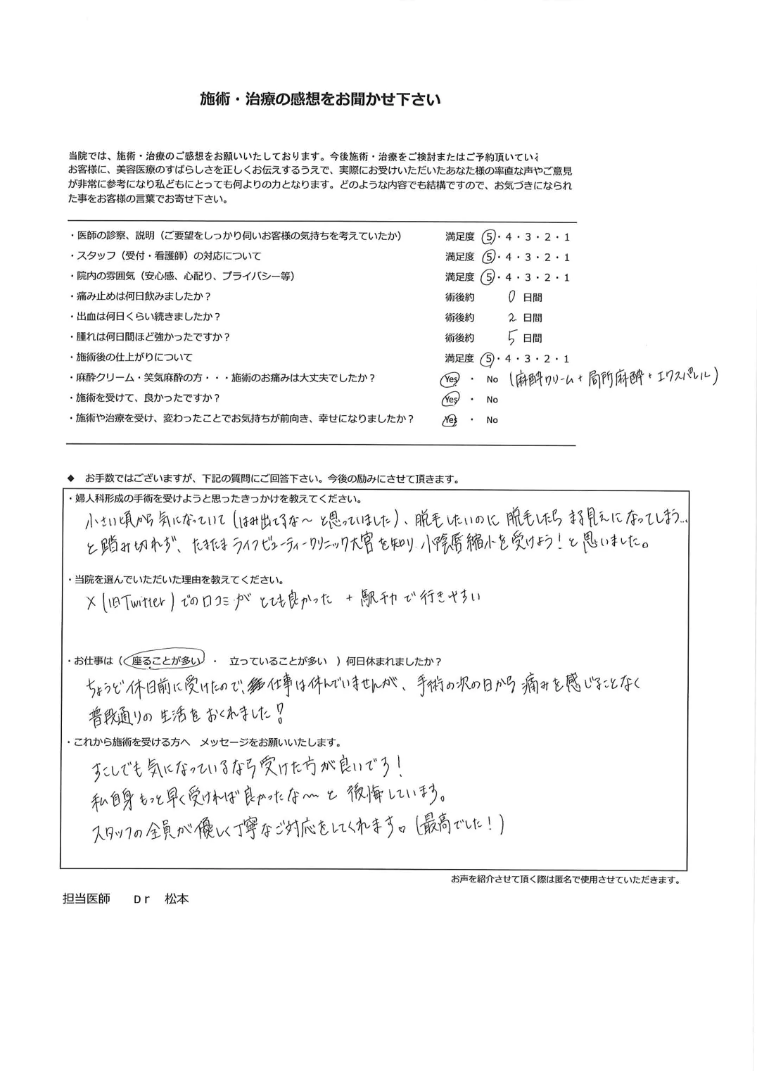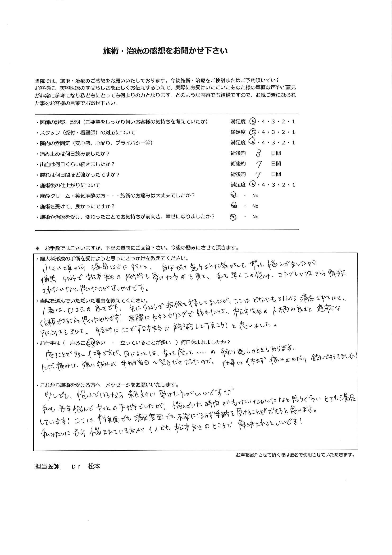 手術は手段であり、目的ではありません。「女性器の形態への不安を解消し快適に毎日を過ごす」ことを確実に実現するため、手術の1カ月後の検診には必ずお越しいただいております。もちろん、それ以外のタイミングであっても、心配なことがある場合にはすぐにご連絡ください。