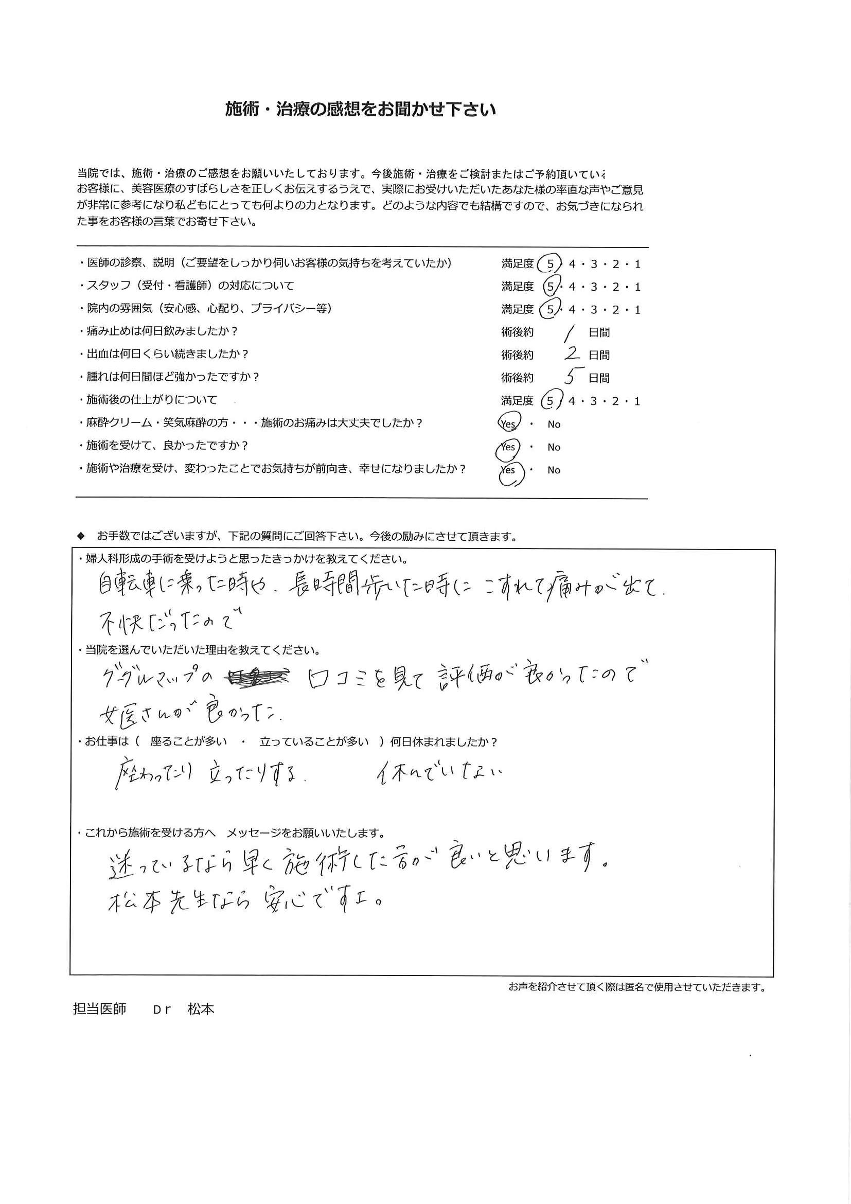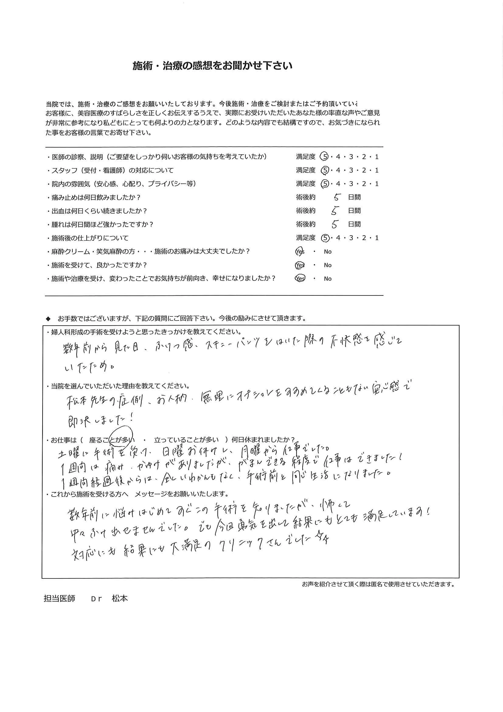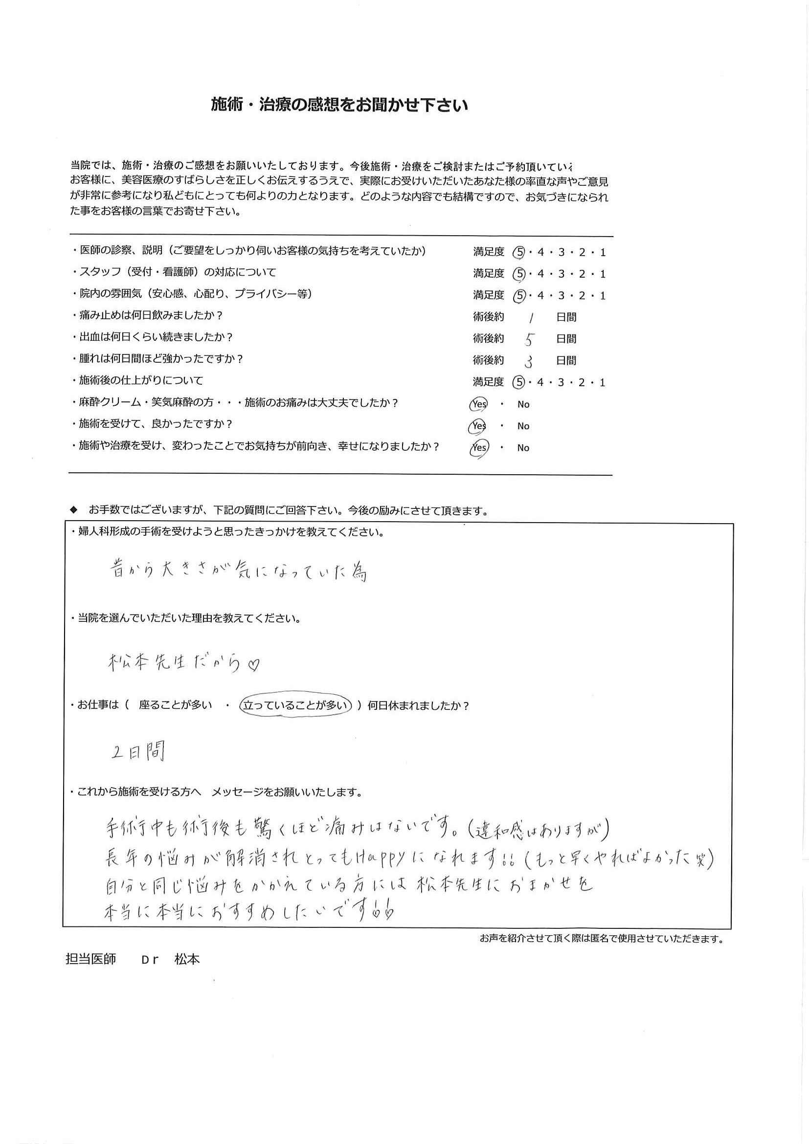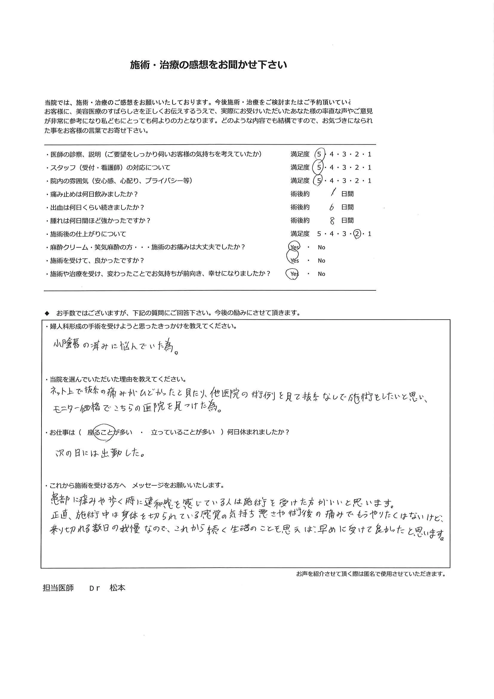 手術は手段であり、目的ではありません。「女性器の形態への不安を解消し快適に毎日を過ごす」ことを確実に実現するため、手術の1カ月後の検診には必ずお越しいただいております。もちろん、それ以外のタイミングであっても、心配なことがある場合にはすぐにご連絡ください。
